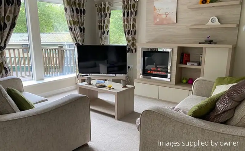 Discover a rare opportunity to own the Willerby Boston, a 40ft x 20ft, two-bedroom lodge situated in the exclusive 'The Orchard' development. This contemporary lodge offers an open-plan living area featuring two-seater sofas, a freestanding media unit, and a coffee table, creating a welcoming space for relaxation.